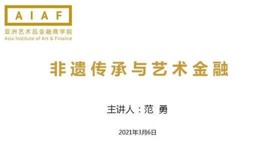 文化和旅游部、教育部、人力资源社会保障部启动了“中国非物质文化遗产传承人群研修研习培训计划”。在文化和旅游部非遗司的指导下,上海市文化和旅游局非遗处的支持下,由上海大学上海美术学院和上海公共艺术协同创新中心承办的“中国非物质文化遗产传承人群研修研习培训计划(上海传统工艺创新设计研修班)”于2021年3月6日上午来到亚洲艺术品金融商学院(AIAF),邀请范勇院长就“非遗传承与艺术金融”为该项目学员们进行授课。
