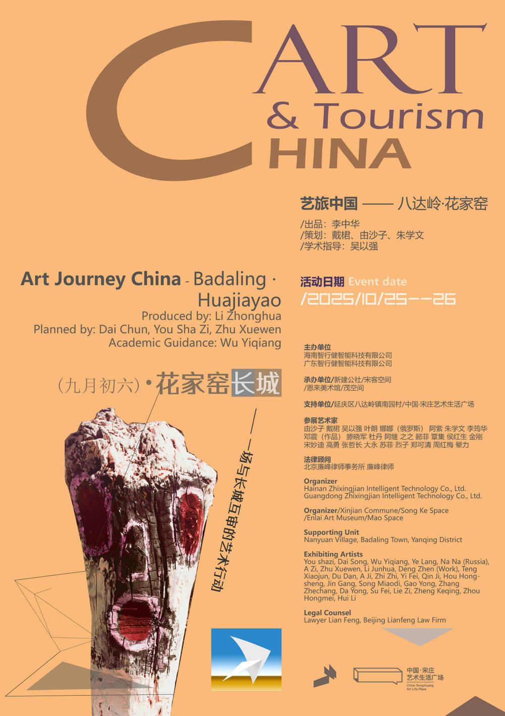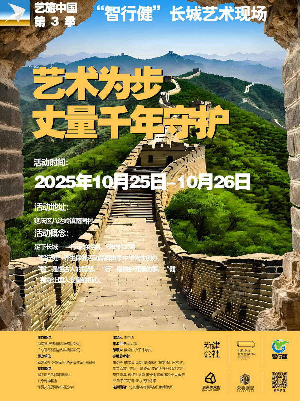 2025年10月25日至26日,由《艺旅中国》组委会与“智行健”企业联合主办,北京延庆八达岭镇南园村协办的 “艺旅中国-智行健长城艺术现场”在北京市延庆区八达岭镇南园村古长城成功举办。本次活动以 “足下长城——行走的经络,守护的文明”为主题,汇聚了近三十位艺术家、企业家与文化学者,共同完成了一场跨越艺术、健康与文化的深度对话。
