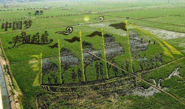 2015年6月22日,辽宁省沈阳市,总占地面积150亩的巨幅稻田画《中国日子 呱呱叫》、《中国梦 幸福起航》、《小梦露》等十三幅“3D稻田画”正式亮相沈阳沈北新区兴隆台锡伯族镇。据了解,锡伯族有种植稻田画祈福的传统,稻田画先设计好要表现的图形,利用先进的3D技术和透视技术,用矢量法定点定桩连线人工填色,种植不同品种有着不同颜色叶子的水稻,绘制出平面,立体,喽空,线条四种不同风格稻田画。