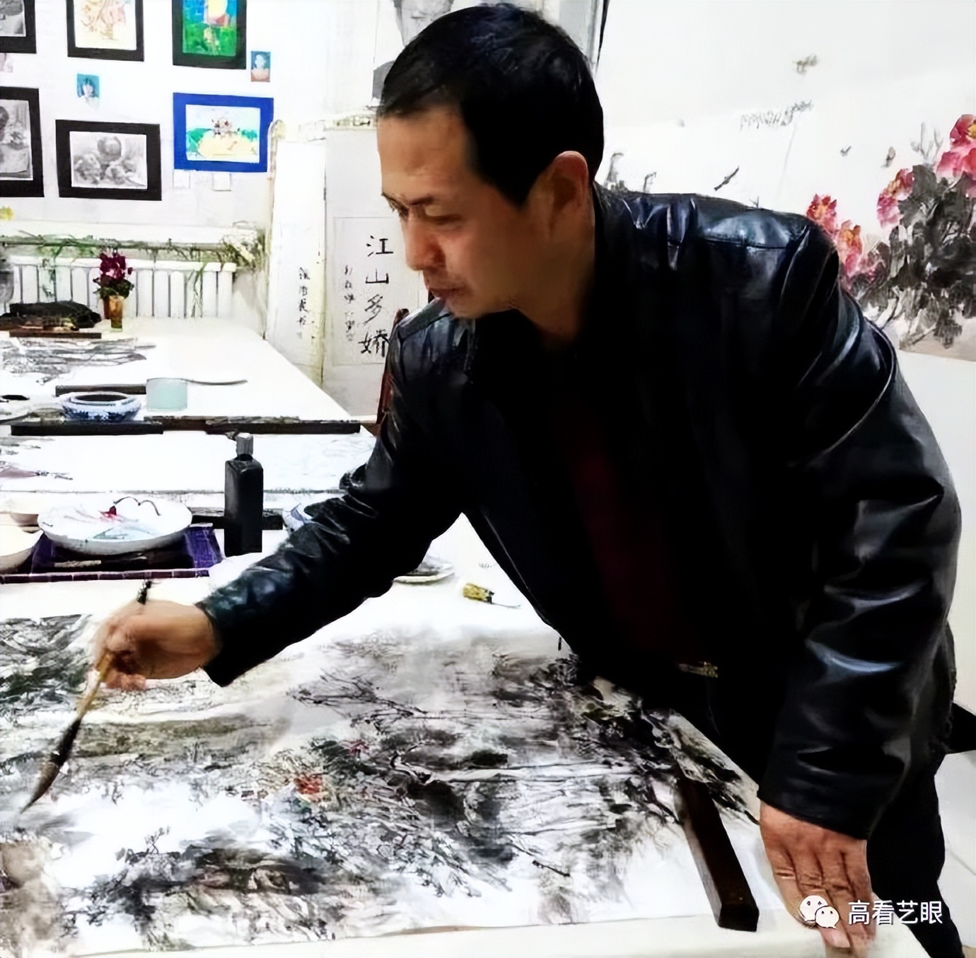 他画山水,特别注重笔情墨韵,敢于大胆落笔,放笔直取,直抒胸臆。强调一个“写”字,即随心写意,随意抒情,笔为心所使,不为外物所拘。皴擦点染,随机生发,一笔下去,痛快淋漓,收放自如,绝不脱泥带水。在空间布局的处理上,能够娴熟地把高远、平远、深远、阔远巧妙地加以灵活运用,切实做到了笔落云起,墨到烟生,水墨氤氲。他尤其精于“知白守黑”,精于色不碍墨,墨不碍色,色墨交融,层层积染,努力把墨色发挥到了淋漓尽致。其创作多选用高度简括而有力的笔触来刻画山、石、树、水和云气,并迅疾地以顺、逆、侧、转、拖、掠种种变化多端的笔法,浓淡干湿焦相互运用,或密体交叉,或点线块面结合,或积墨焦墨层层叠加,从黑团中发掘明亮,从纷乱中理出秩序,以此强化画面的节奏感、韵律感,进而由近及远,逐步推进,立体生动地展现出山水的壮阔、雄浑、苍茫,给人以强烈的动感和力量。